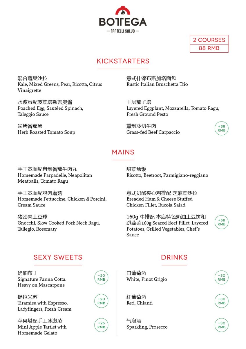 If you just can't shake that deep and never-ending feeling of being cold, it might be time to get yourself down to Bottega, tucked away across from Taikoo Li North in Sanlitun for their new lunch menu, available Monday to Friday, noon-3pm. Their new offerings tilt towards the hearty and warming, with six starters and six mains on the menu, and for RMB 88 you can bag one of each.