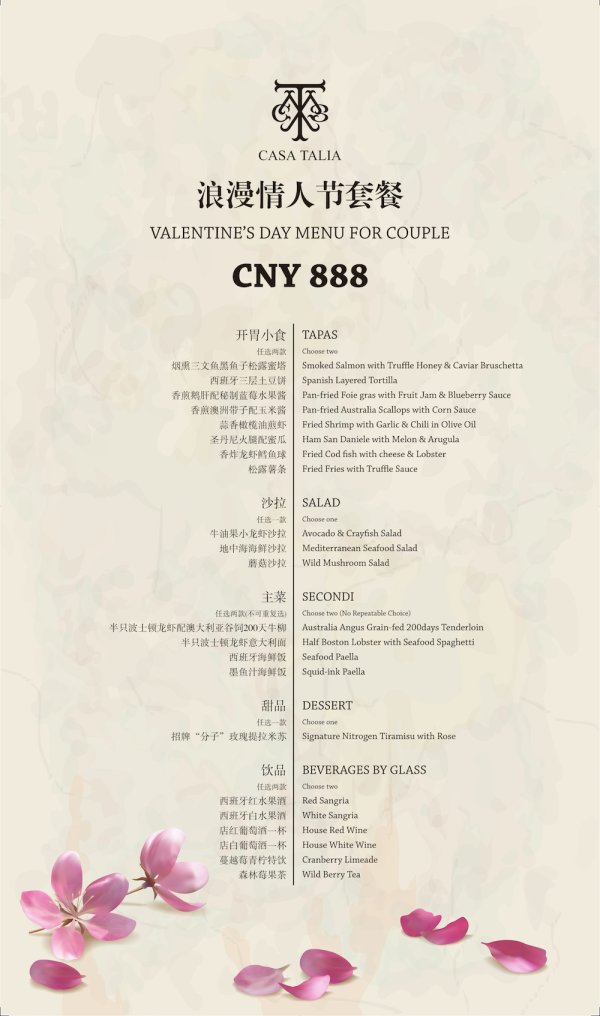 This Valentine's Day, Casa Talia is offering a four-course sharing menu, starting with a choice of two of their innovative tapas, by a salad and a choice of main course, and finishing with their signature "nitrogen tiramisu" with rose. The menu also includes two drinks, including house wine or sangria.
