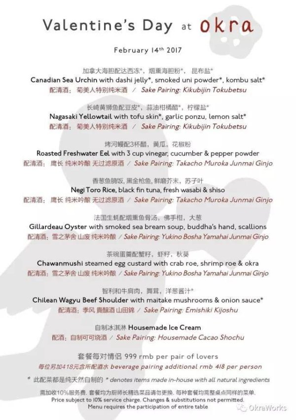 This Valentines Day, Okra 1949 is here to help you to pave the way to your lover's heart. Each dish in our indulgent eight-course Valentine's Day Menu will awaken the senses, stimulate the imagination, touch the soul and melt your hearts. And the sake pairing? Like you two: a perfect match!