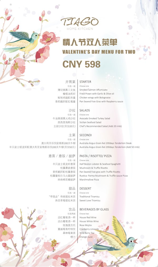 Tiago are offering a romantic five-course sharing menu for Valentine's Day this year, with a choice of starter, salad, main course (a tasty Australian Angus beef tenderloin), pizza/pasta/risotto, and a dessert. The menu also includes two drinks, including house wine.