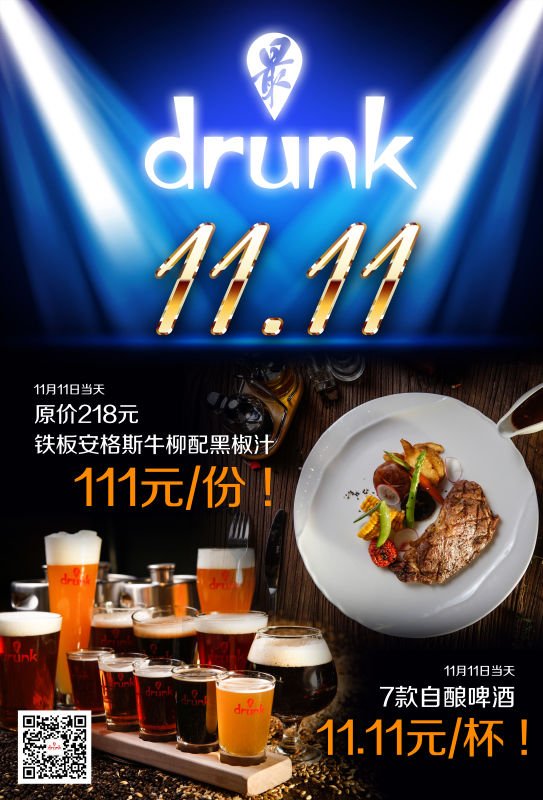 Microbrews at Drunk Bar will be on a special offer for Singles' Day this Friday: all seven beers on tap will be RMB 11.11 each from 5pm till late. The Australian angus beef is also priced at RMB 111 per set.