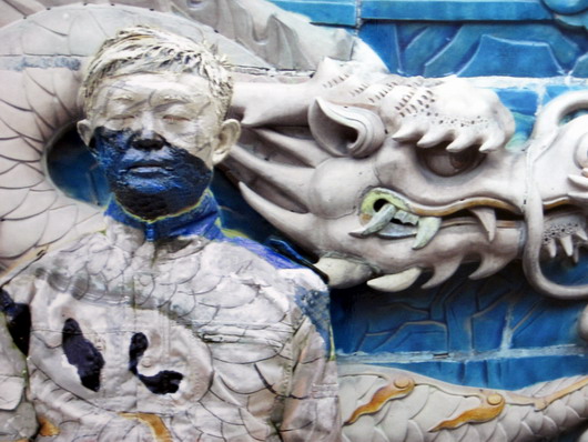 We won’t discuss the possible embedded meanings when he’s standing in front of a Chinese poster about the power of voting, but we can point out that his impressive rendering of the nine dragons at Beihai park carries a sense of pride and cultural celebration.