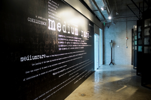 The cement floor and walls are cold and sleek. There are few decorations to detract from its drabness, with the exception of a dark wooly rug, a wooden stage and the words “medium rare" emblazoned behind it via a video projector. Right away, your eyes are drawn to the clothes, which at first glance appear equally unadorned – until you take a closer look at the nuances in fabric, texture and shape.