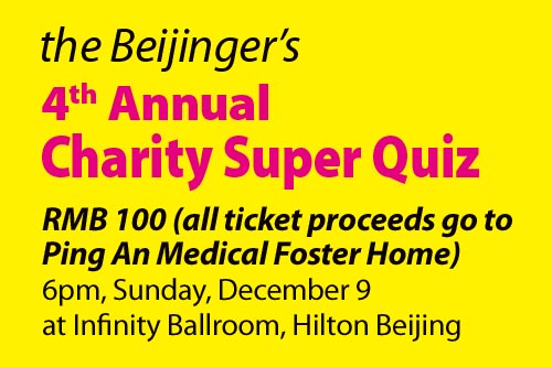If you want a regular table for you and nine of your smartest pals, you can book it now by emailing events@thebeijinger.com or calling 5820 7700 ext 866. Your table will be confirmed when you come to the office to drop off the RMB 1,000 – all of that money will go to help the kids at Ping An Medical Foster Home.