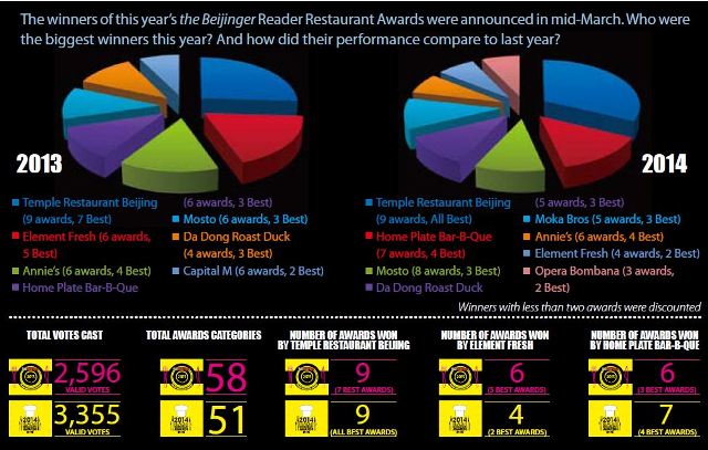 Biggest Winners of the Reader Restaurant Awards 2013-2014 Kipp Whittaker | Mar 27, 2014 11:00 am | Add a comment | 1636 reads There's nothing more suitable to represent the various stats from our Reader Restaurant Awards than a pie graph! Here then are the results from our recent 2014 Reader Restaurant Awards as compared to winners from last year. Photo: the Beijinger Beijing NewsOur Stuff2014 Reader Restaurant AwardsStatthe beijingerTemple Restaurant BeijingKipp Whittaker Related stories : Wokipedia: C is for... Announcing the 2023 Cheesy Pizza Month Lucky Draw Winners A Look at the Belt and Road Food Fest Market Vendors Wokipedia: D is for... Save the Date! Hot and Spicy Festival 2023 is Heating... Meet The Exclusive Burgers You Can Only Find at Burger Fest Login or register to post comments.