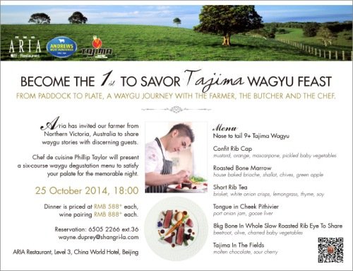 Head over to Aria this Saturday to savor a feast of wagyu beef, presented by their farmer from Northern Victoria, Australia. The nose-to-tail six course menu (RMB 588, RMB 888 with wine pairing) includes roasted bone marrow, short rib tea and an 8kg bone-in roasted rib eye to share.