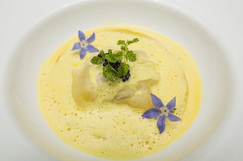 The Brasserie New Year’s menu then takes a highly refined turn with a bowlful of ravioli submerged in sunrise yellow langoustine sauce, which is then sprinkled with bits of luxurious caviar.