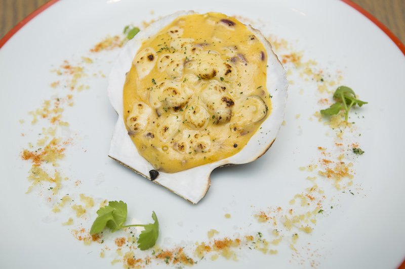 And although the sea cucumber may be a feast for the eyes as well as the stomach, the meal’s next dish is an all-the-more aesthetically pleasing baked king scallop drowned in a creamy wasabi sauce.