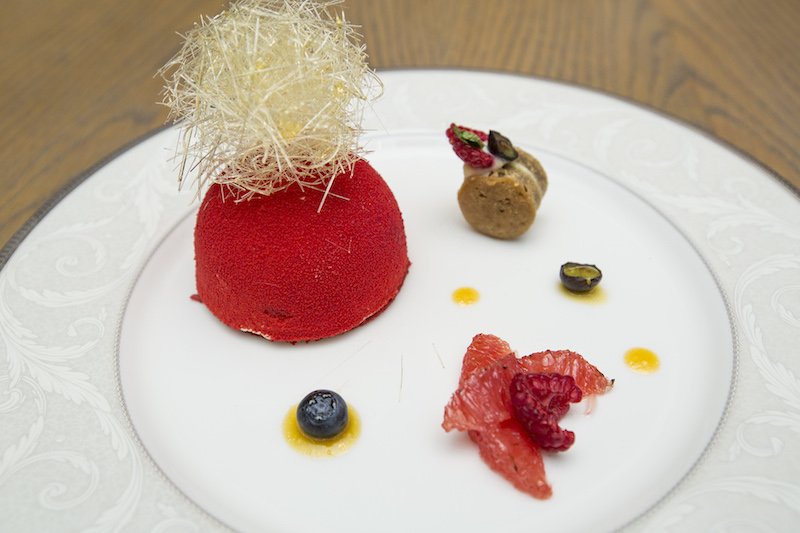 The Brasserie New Year’s meal then climaxes with a sweetly curvy crescendo: a bite sized blazing red moelleux “New Years Dome” dusted with berry flavoring, and bursting with vanilla ice cream in its center.