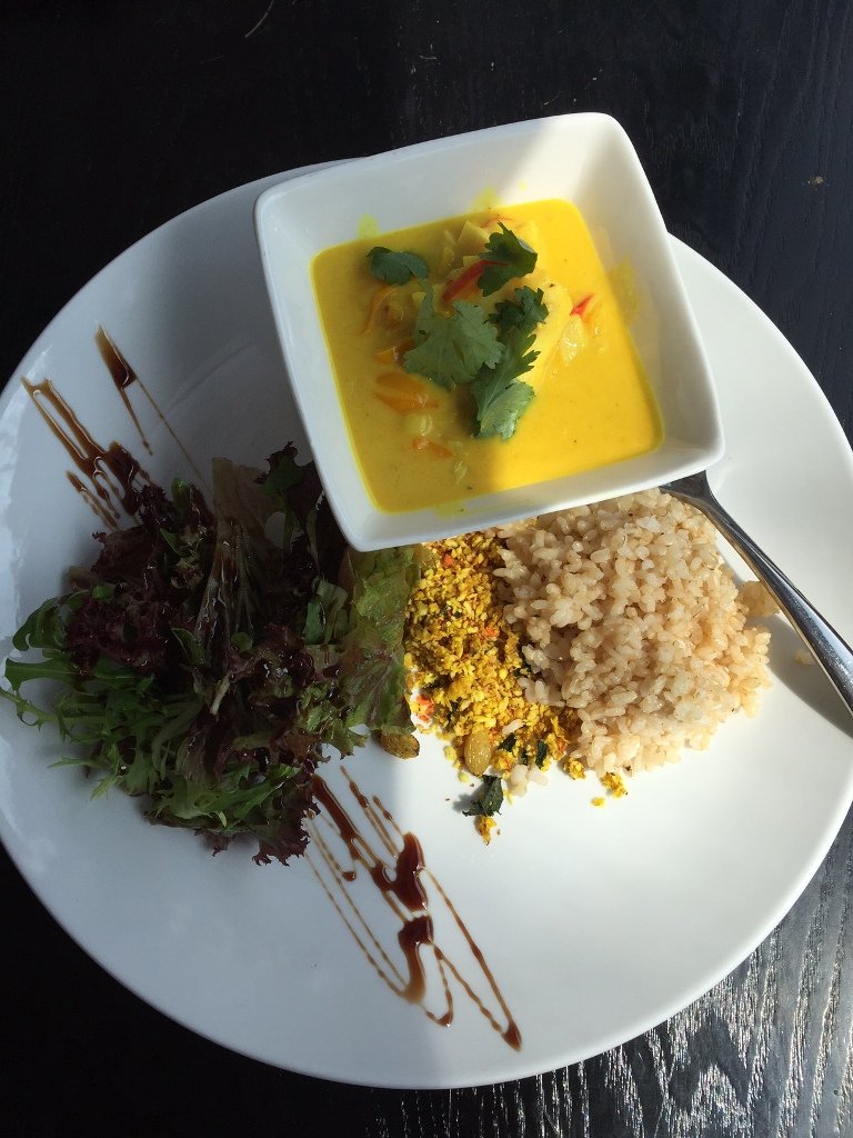 As for the main, we tried the pumpkin and sage risotto, which came with braised bok choy and celery-almond gremolata, as well as the fish stew with tilapia, peppers, and coconut milk. The fish stew was a definite favorite, proving both spicy and crunchy thanks to a hearty mound of banana farofa.