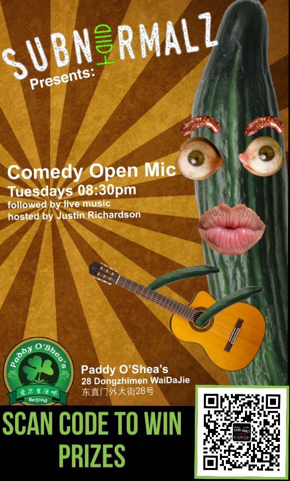 Subnormalz Comedy Club presents Open Mic Stand-up Comedy on Tuesdays at Paddy O'Shea's, with old school Mancunian Gary Betney hosting this week's event. See at least 10 of Beijing's best comedians performing stand-up comedy, and four minutes of stage time is yours if you have the guts! Open Mic Music hosted by Justin Richardson of NZT band will launch directly after the jokesters finish their bits. All comedians and musicians performing will get one free local beer or house mixed drink. 8.30pm. Free. Paddy O'Shea's