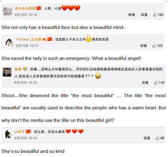 On Friday, August 19, a China Daily article details how onlookers' photos of Wang assisting the young mother-to-be went viral on social media. The article says "Chinese Internet users have remarked on Wang's beauty as well as her kind, competent behavior during the emergency birth."