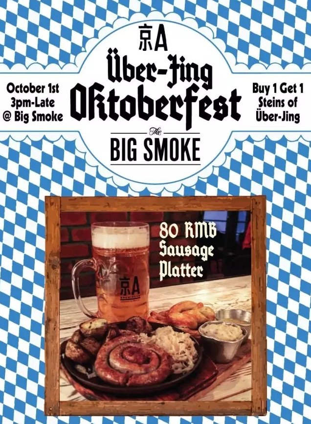 Also, Jing-A launches their seasonal Über-Jing Oktoberfest Lager again, with 6.5 percent ABV, a full-bodied beer brewed in the traditional style of German Märzen (March beer). This year they have chosen The Big Smoke to host the launch, and at 3pm on wards on Saturday (Oct 1) you can get a buy-one-get-one on liter steins of the freshly kegged beer (RMB 110). They will also offer a German Oktoberfest platter for RMB 80, which includes a huge pinwheel sausage, freshly baked pretzels, sauerkraut, and roasted potatoes.