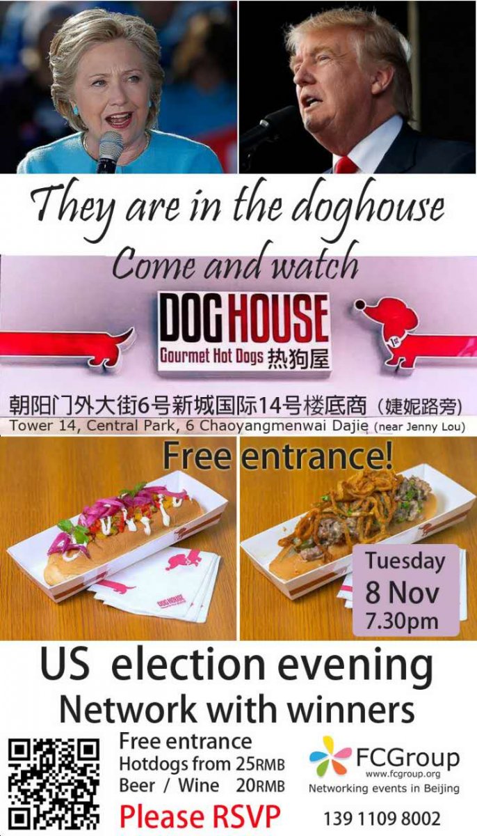 Clinton and Trump fight it out "in the dog house," literally at the Dog House, serving buns and weiners with lots of toppings, and giving attendees an opportunity to "network with the winners," on November 8 at 7.30pm. Entrance is free, hotdogs are RMB 25, and beer and wine will be sold for RMB 20 per glass. To RSVP, see the poster above or click here for more information.