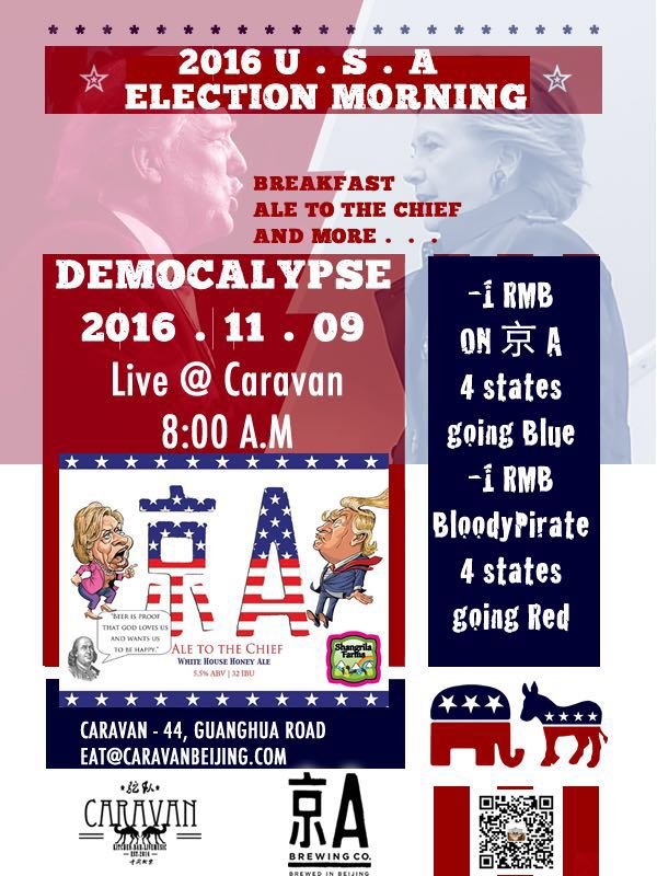 Both of Badr Benjelloun's fine establishments will be showing the election live, along with a fun discount 1 kuai discount on Jing A's special Ale to the Chief and Bloody Pirate as blue and red states come in, respectively.