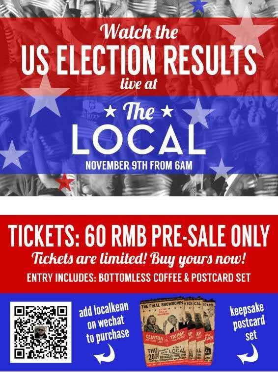 [SOLD OUT] The LocalThis Courtyard 4 mainstay will also be showing the election live. Management says that because of the broadcast's early hour there won't be any booze discounts. However, The Local will be offering a special breakfast menu that has yet to be finalized (check back here in the coming days for an update). Entry costs RMB 60, presale only.