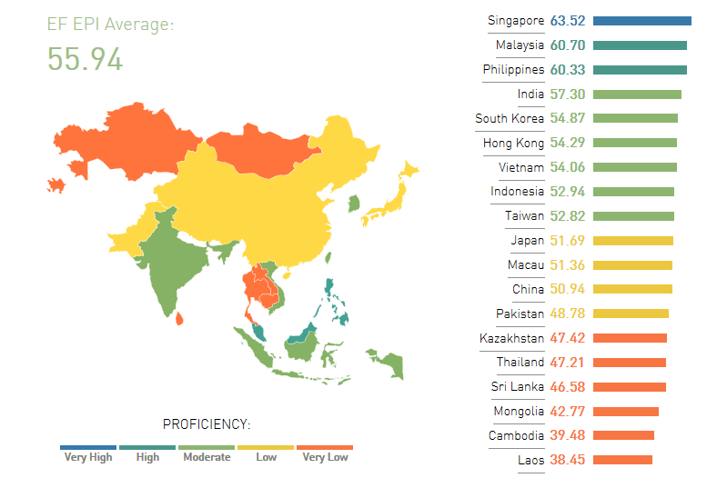 EF, with English training centers worldwide, compiles its data from nearly a million standardized tests from around the globe (you too can participate: taking the free test here to see how you do. There are both 15 minute and 50 minute versions).
