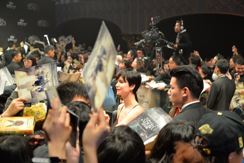 Freckly, fair-haired leading man Eddie Redmayne (famed for his Oscar-winning turn Stephen Hawking in The Theory of Everything) was on hand, looking debonairly trim in a blue pinstriped suit. He was accompanied by costars Katherine Waterston (who plays Porpentina Goldstein, an overqualified witch stuck on a dead end assignment), Alison Sudol (who plays Queenie, Porpentina's younger sister), Dan Fogler (who plays Redmayne's muggle sidekick Jacob Kowalski), along with producer David Heyman and director David Yates. We were invited by the event coordinator Weying Technology Co., a marketing and distribution platform for movies and sports that put on similar events in Beijing for the stars of Jason Bourne, The Martian, Captain America: Civil War, and other recent hit films.