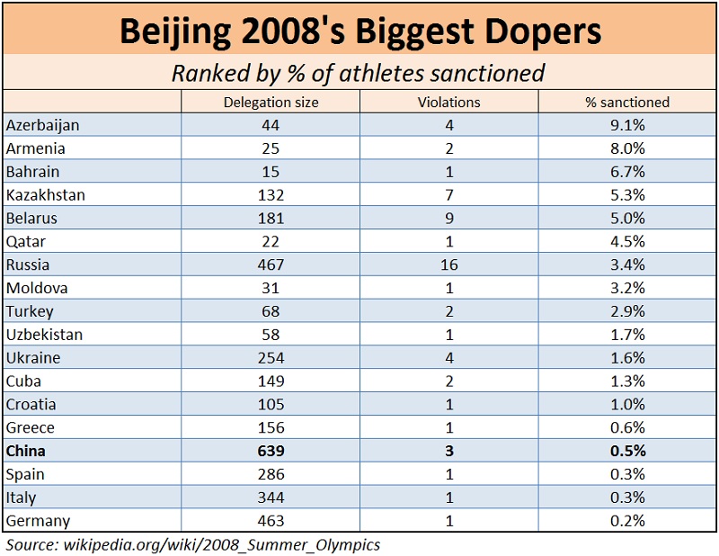 It's not unusual – in fact it's par for the course in the modern age – for Olympics medal standings to change post-Games. And testing reveals that Beijing 2008 was not a particularly doped-out event: approximately 11,028 athletes participated, meaning less than half of 1 percent (0.49 percent) tested positive.