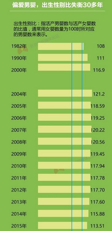 The report also states that the ratio of newborn boys to girls has been in imbalance for the last 30 years, which at its peak in 2004 reached 121 boys for every 100 girls.