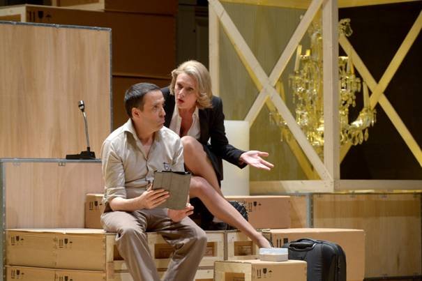 French company La Comédie de Reims have given the play a fresh spin and a contemporary setting. Harpagon’s house, where the action takes place, becomes a warehouse filled with cardboard boxes, representing the uselessness of stockpiling wealth. Everyone in the play is obsessed with money, despite being surrounded by it.