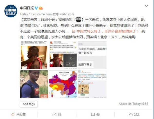Compared to everything else in the news, the weather is always more difficult to report because numbers and statistics never convey the human experience of it. And with a heat wave currently attacking the country, Chinese news organizations are finding the best way to describe the unbearable heat to their readers is to report local weather conditions are responsible for giving an African man a tan.