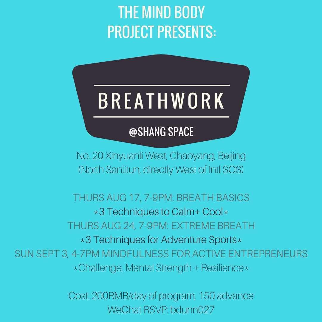 Breathe in, breathe out, and don't slap that teen who pushed you on the subway. Twice. Longtime Beijing expat and co-founder of the Mind Body Project Erin Henshaw has spent the past two years in the US teaching yoga and mindfulness classes at elementary schools and companies. Erin is back in Beijing for a month and excited to share her unique programs, which are influenced by her yoga, neuroscience, and breath-work studies in India, China, America and, most recently, Indonesia. Starting with a breathing technique for clarity and relaxation, as well as basic neuroscience and forceful exhalations for energy, at this first event in the Breathwork series, you will learn how different breathing techniques are used for different purposes. While we care so deeply about what we eat, why not care about an action we do even more often – breathing. Contact them on WeChat (bdunn027) for more information. 7-9pm. RMB 200, RMB 150 (advance). Shang Space