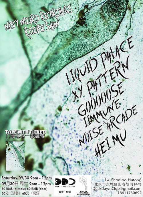 DDC and Nasty Wizard Recordings are proud to present to you a night of wonderfully leftfield sounds and ideas – in celebration of the split tape between Beijing’s Liquid Palace and Singapore’s (((connection_error))) audiences will be treated to performances from sound art duo XY Pattern, Shanghai electronic wiz Gooooose (of Duck Fight Goose), a live set from iimmune (featuring Noise Arcade on drums), Shanghai minimalist post-punk soundshifter Hei Mu and the dream team of diabolical noise themselves – Liquid Palace. Did I mention free cassettes at the door? RMB 60
