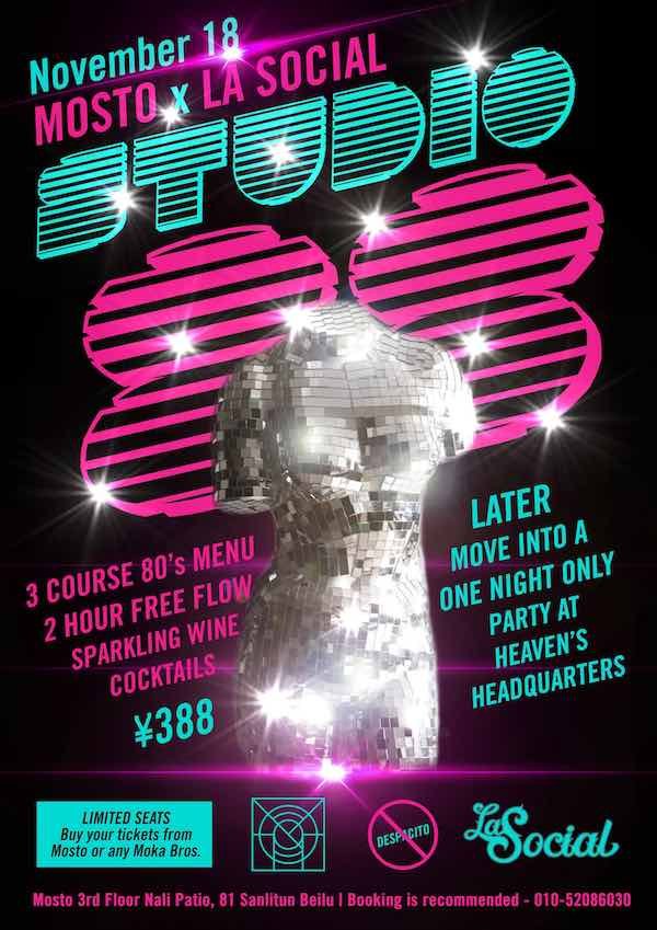 If you prefer going out to staying in, then consider making Mosto your destination this weekend for their '80s-inspired Studio 88 event this Saturday, Nov 18. They'll be dusting off the disco ball, neon leg-warmers, and Wham! records and putting together a three-course menu of retro dishes. Tickets cost RMB 388 per person, including dinner and two hours of free-flow mimosas. After dinner, the party will move on to La Social, where you are guaranteed plenty of '80s tunes (and strictly no Despacito).