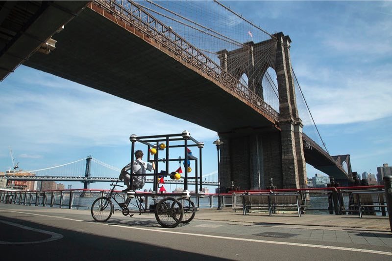 French-born, Beijing-based self-taught multimedia artist Niko De La Faye began that globe-spanning sanlunche ride in 2011, building a colorful installation akin to a mobile that dangles above a baby's crib, and strapping it to the back of his nifty Chinese motorized tricycles. Calling the piece M2B, he saw it as a beautiful, soothing and slow-moving universe unto itself, contrasting wildly with the frantic gridlock traffic he encountered while driving it in Beijing and Shanghai.