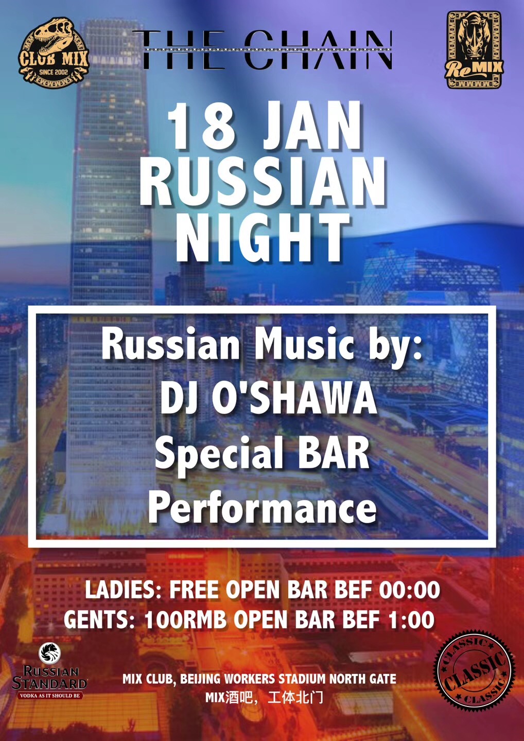 Thursday also happens to be Russian night at Gongti's bastion of bad heads. Sponsored by Russian Standard Vodka, DJ O'Shawa takes charge of getting the crowd in the mood, although the open bar for ladies before midnight will no doubt do its fair share of the work too. 10pm. Free (ladies, open bar till midnight), RMB 100 (gents, open bar till 1am). Mix Club