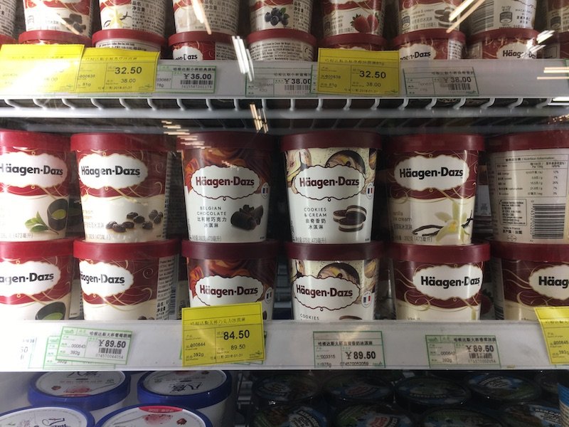 Finally, we look at ice cream. We don’t even like Häagen-Dazs that much, but we guess that it is maybe the most popular imported brand of ice cream that’s currently available in China. We would like to note that just below these pints were the Ben & Jerry’s that are in our humble opinion far superior and a good RMB 20 cheaper. Still not cheap, but will be a far more satisfying way to expand your waistline while watching Friends reruns. Even if you go to Cow’s Creamery, you can expect to spend in the ballpark of RMB 50 for two scoops in a cup. It looks like we’ll be sticking to our Magnum Bars from the xiaomaibu for the foreseeable future, unless the dairy industry of Inner Mongolia starts to up their ice cream game.