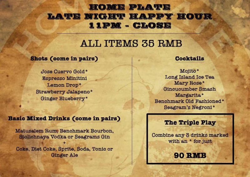 Speaking of late night libations, Home Plate have just launched a new late-night happy hour, running from 11pm til close. They have a selection of drinks priced at just RMB 35, including long island iced teas, pairs of shots, and pairs of mixed drinks – a progressively more dangerous prospect as the week rolls on ... See the poster above for full details.