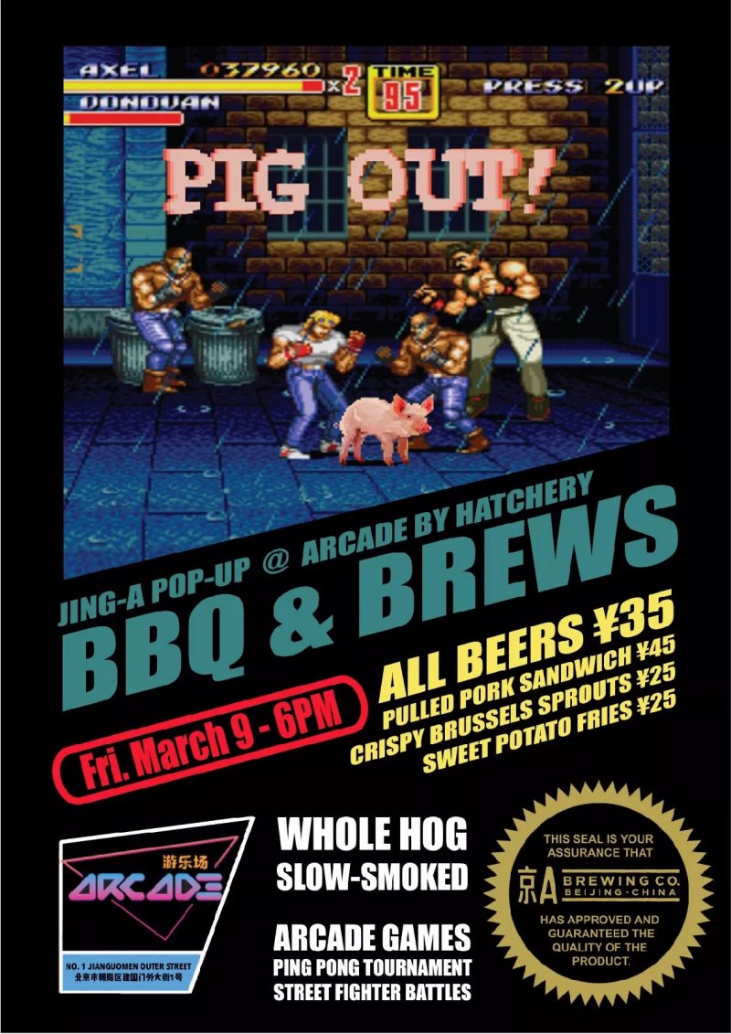 This Friday, Mar 9, Jing-A will be smoking a whole hog and rolling it down to Arcade for a beer and barbecue pop-up. Grab a pulled pork sandwich for RMB 45, along with sides of crispy brussels sprouts or sweet potato fries, both RMB 25. You know they'll be making full use of Arcade's ping pong tables, too, so look out for details of a beer pong tournament. Even if you're not in it to win it, all Jing-A beers will be RMB 35 on the night, including the punchy Airpocalypse Double IPA.