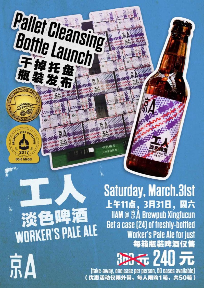 Let's start with Jing-A, which will host its annual Pallet Cleanser (geddit?) on Mar 31, providing great deals on bottled Worker’s Pale Ale. For RMB 240 you can get a case of this pale ale (regular price is RMB 360 and the discount works out to RMB 10 per bottle) from 11am until their 50-case stock runs out (limited to one case per person). When Jing-A put this deal on last year, they sold out in less than an hour so set your alarm, get up early, grab a coffee, and run to Jing-A Brewpub Xingfucun to stock up.
