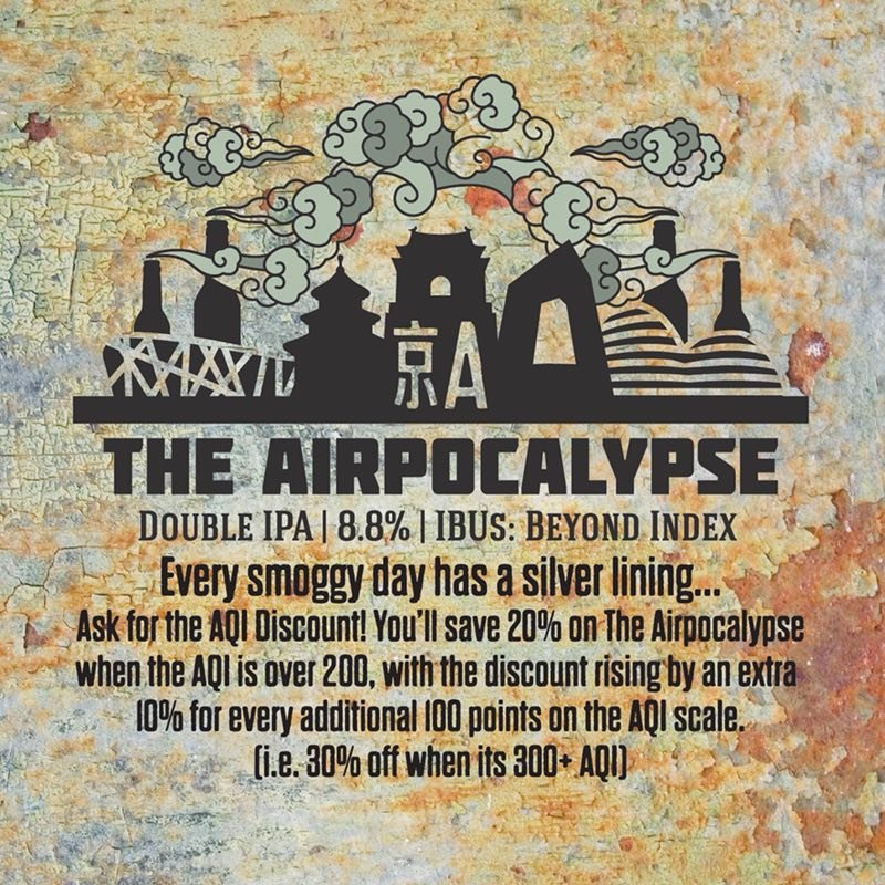 Also, a reminder for those who like to drink the pollution away, every (smoggy) cloud has a silver lining, in this case, it's Jing-A beer hazy Airpocalypse IPA 20 percent discount when the AQI is over 200 (and an additional 10 percent for every 100 AQI over).