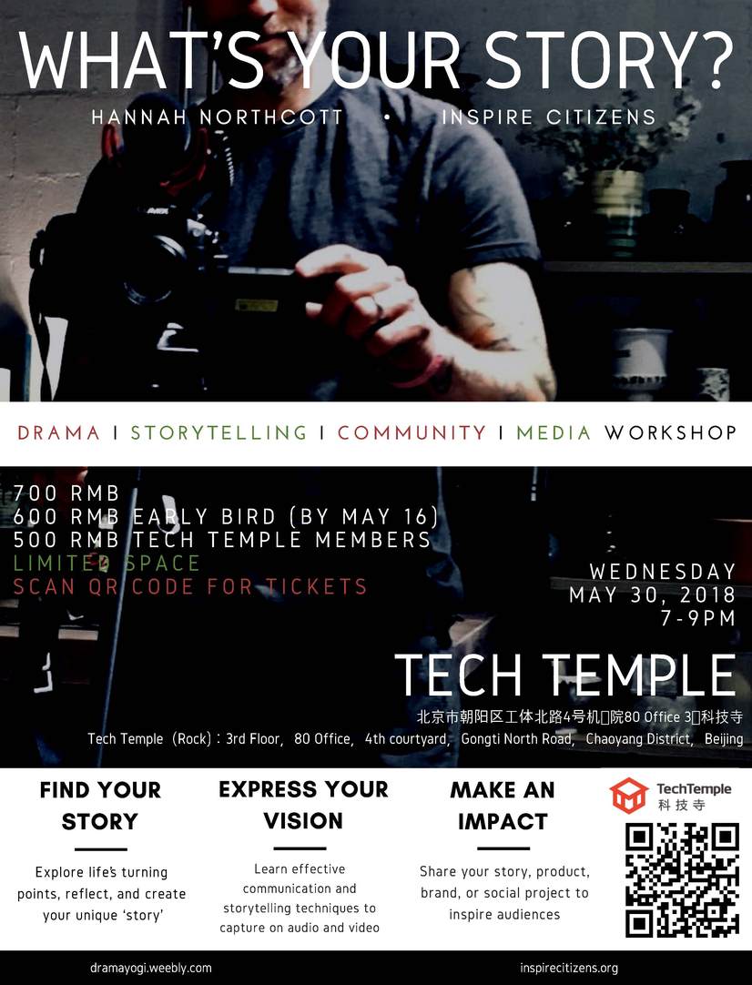 Harness your story via this workshop which "combines Hannah Northcott’s theater and performance expertise with Inspire Citizens’ community media know-how into an engaging two-hour journey that sparks authentic and creative collaboration, effective communication, and personal exploration." Channel and look back on the experiences you have had in order to make something new and weave it into a story that is truly personal. RMB 700. 7-9pm. TechTemple