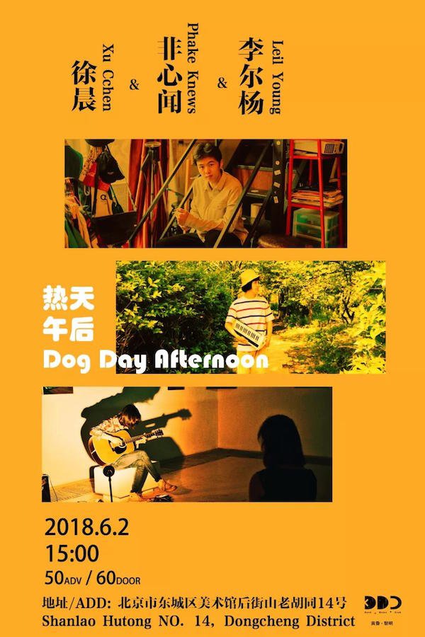 ‘An afternoon alley in June, the heat freezes the scenery, but it can't stop the beat’. Three musicians with different characteristics and backgrounds, including the 70s evoking Li Er Yang, the city pop meddling artist Fei Xinwen aka Phake Knews, and the Xinjiang-educated Xu Chen for a dog day afternoon. 3pm start. RMB 60