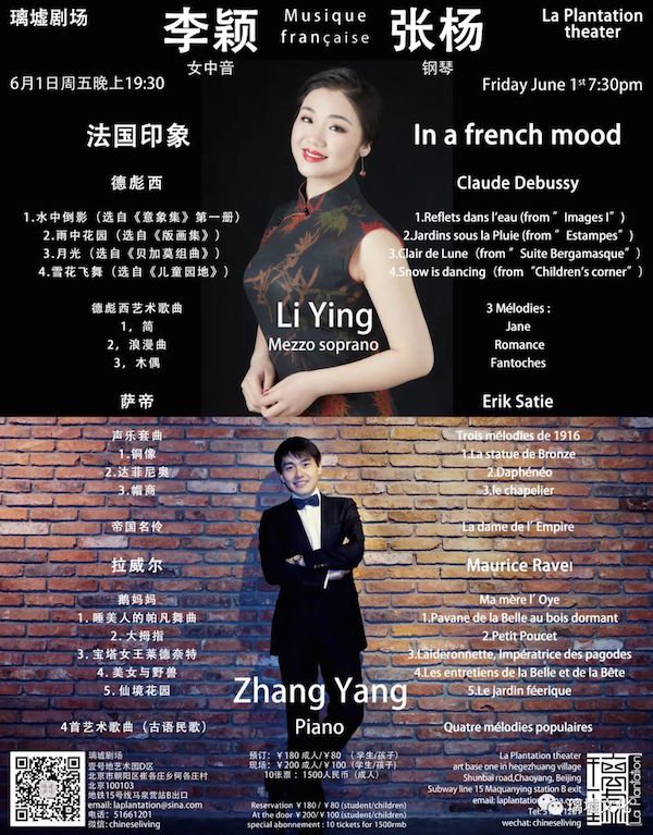 Get in a French mood this evening as Mezzo-soprano Li Ying and pianist Zhang Yang play through Claude Debussy, Erik Satie, and Maurice Raver classics. RMB 200
