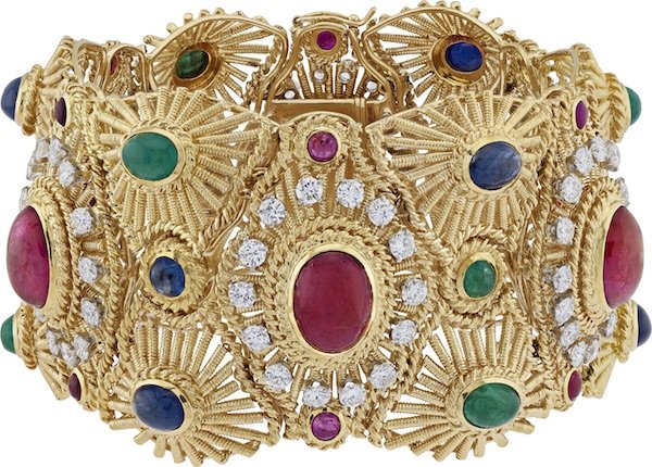 Platinum, enamel, rubies, sapphires, emeralds, diamonds