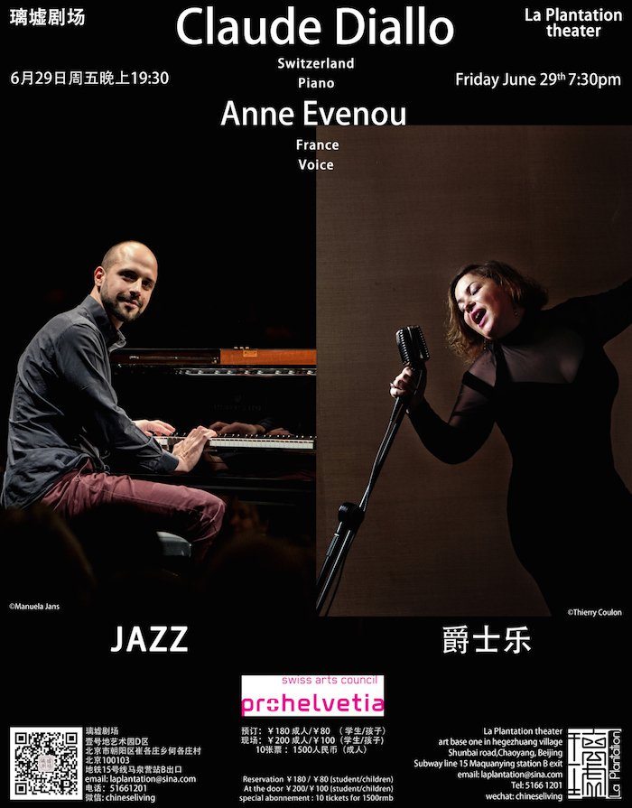 Expertly skilled Swiss pianist Claude Diallo brings innovative concepts to the accepted styles of piano composition alongside French versatile jazz singer Anne Evenou who sings in six different languages, including Chinese. RMB 200