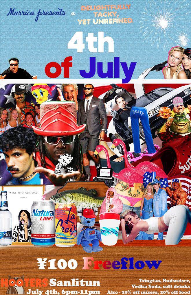 Hooters wants you to celebrate Independence Day the way the Founding Fathers intended: enjoying their RMB 100 free-flow on Budweiser and vodka sodas, not to mention 20 percent off on mixers and 20 percent off on food. Oh say can you see indeed. RMB 100 (free-flow on select drinks). 6-11pm. Hooters