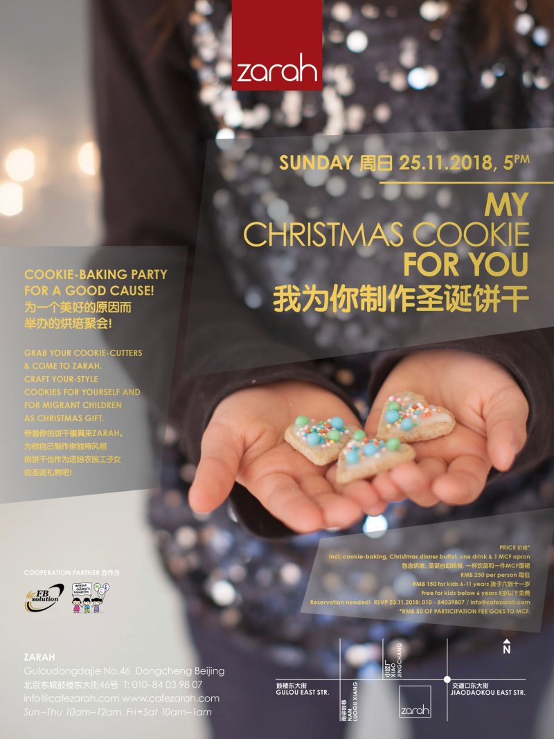 At Zarah's Sunday cookie making class, not only will you get to make, eat, and revel in cookie joy, you'll also feel good about it too. That's because this Christmas cookie workshop is specifically geared towards sending sweets to youngsters in need as part of a collaboration with the Migrant Children Foundation. The evening includes cookie-baking, a buffet, and a drink. RMB 250 (reservation required). 5pm. Zarah