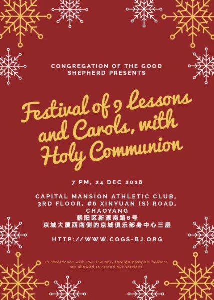 The Congregation of the Good Shepherd, an interdenominational, liturgical Christian fellowship, will hold the Festival of 9 Lessons and Carols with Holy Communion on December 24 at 7pm. This will take place at Capital Mansions Athletic Club. Contact Spencer Musick via WeChat (ID: musickpsm) or email cogs@fastmail.fm if you wish to join the service. Please note that this activity is open to foreign passport holders only.