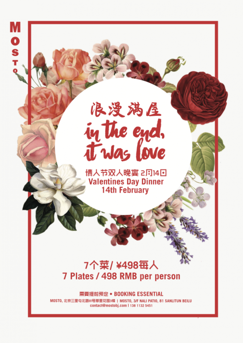 There are few more reliably romantic restaurants than Mosto, and as usual, they have come out with a tasty-looking menu for Valentine's Day. Share starters like yellowfin tuna causa and French oysters with caipirinha sorbet with that special someone, then choose a main course from options such as Icelandic cod and Josper-roasted beef. Book ASAP for this one, tables will go quickly. RMB 498 per person. 5.30-10.30pm. Mosto