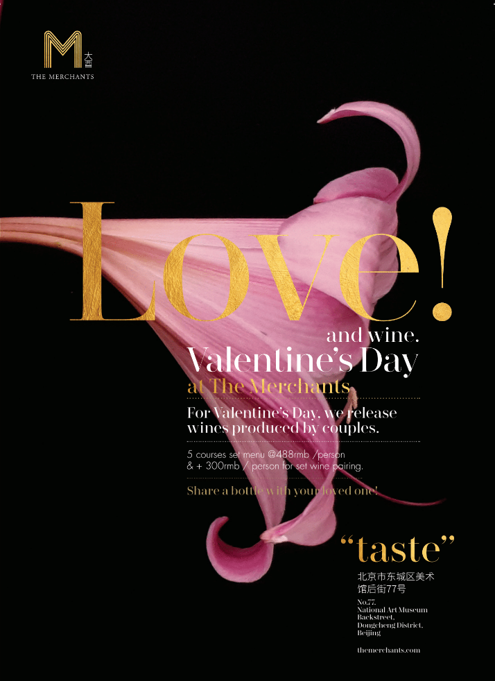 In an interesting twist on the usual "meal and wine pairing" formula, Meishuguan wine bar and restaurant The Merchants has prepared a selection of wines made by couples. Enjoy a five-course dinner accompanied by the aforementioned wines for RMB 788 per person. RMB 488 per person, RMB 300 for wine pairing. 7pm-midnight. The Merchants