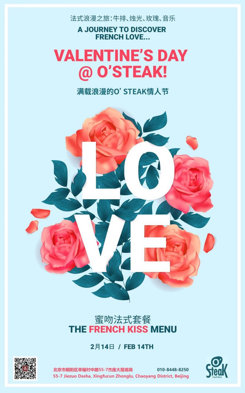Where better to celebrate a festival of romance than at a French restaurant? O'Steak has two French-themed menus available, one priced at RMB 428 per person and one priced at RMB 888 per couple. Both menus feature their signature steak, as well as French classics like lobster bisque and escargots. Oui oui! Menus from RMB 428. 11am-11pm. O'Steak