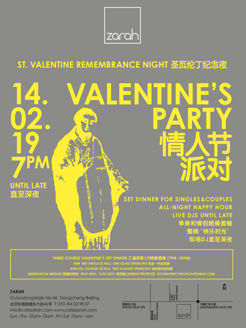 If the idea of a romantic dinner surrounded by cheesy decorations fills you with dread, head over to Zarah, where they are ignoring the mushy stuff and throwing a Saint Valentine Remembrance Party. They'll have happy hour all-night with wine by the glass for RMB 30, as well as a three-course set menu priced at RMB 188 per person or RMB 376 per couple. No fairytale romances allowed. RMB 188, RMB 376 (per couple). 7pm-1am. Zarah