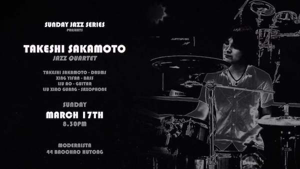 Japanese jazz drummer Takeshi Sakamoto – who’s worked with jazz legends including Jerome Harris and Sonny Rollins, and whose performances include pop, rock, funk, rhythm, and blues – performs alongside bassist Xing Yifan, guitarist Liu Ao and saxophonist Liu Xiao Guang. FREE
