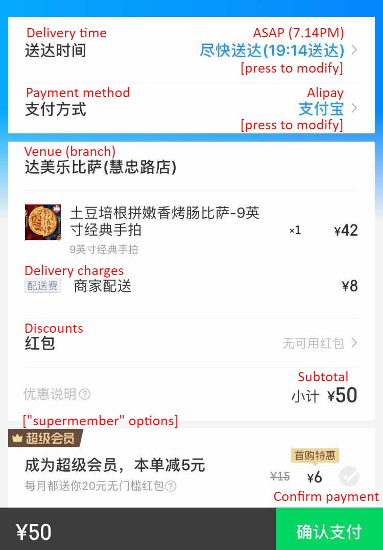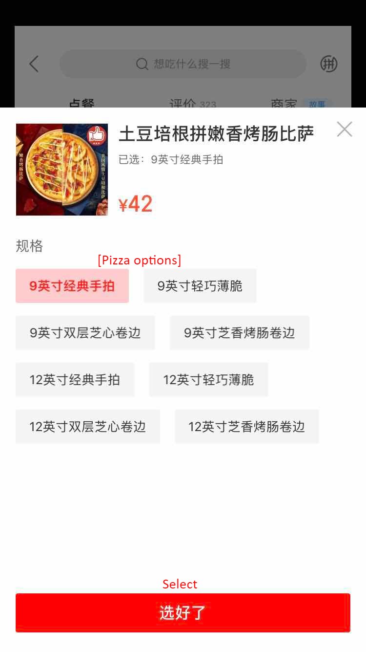 For some items, you can just press the ‘+’ button to add an item to your cart, which will show up at the bottom of the screen. For other items, you need to choose specifications (选规格 xuǎn guīgé). For instance, when ordering a pizza, you would need to indicate the size of this pizza that you want (6, 9, or 12 inches). The price will also sometimes change accordingly depending on whether you add or remove ingredients.